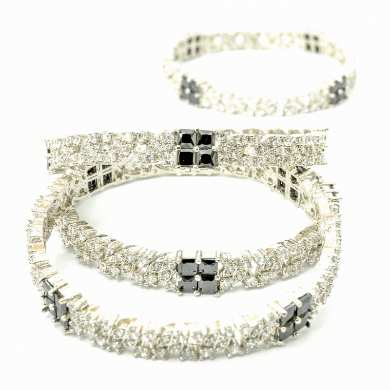 The F-Jewels Black Stone Karra Set is absolutely exquisite! The set includes a pair of karra bangles adorned with striking black stones that create a bold and elegant look.