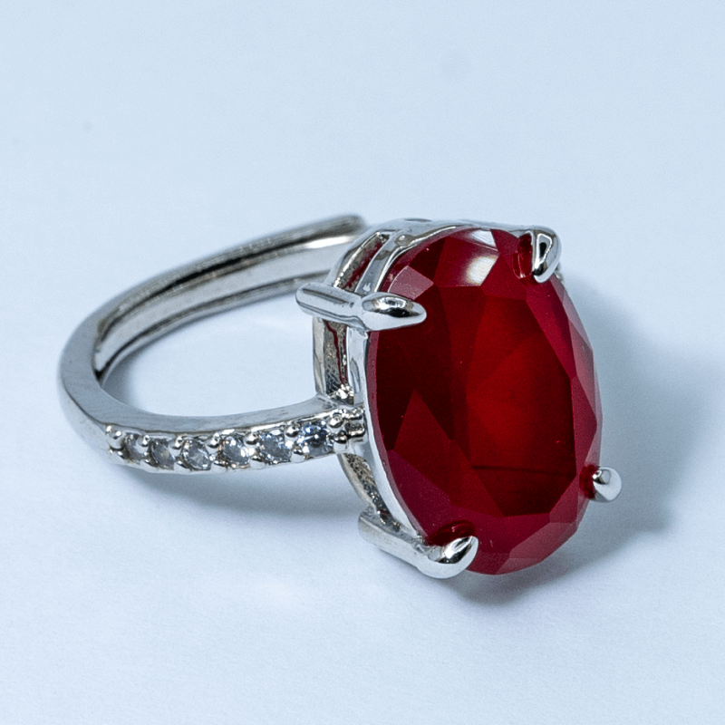 At its heart lies a mesmerizing red diamond—a rare and captivating gemstone that defies convention. Its fiery hue evokes passion and cosmic energy. - Silver Band